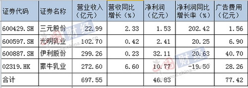 作为快消品,乳企的广告宣传费用不容小觑。据统计,伊利、蒙牛、光明、三元上半年广告支出合计金额77.72亿元,与去年同期的58.75亿元同比,增长32.28%。有网友在股吧里评论称,中国乳企的业绩不是干出来的,是“吹”出来的,“哥喝的不是奶,是广告。”